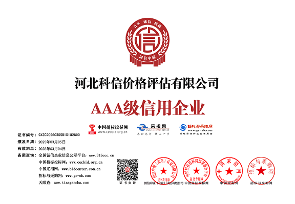 河北科信價格評估有限公司為"AAA"級信用企業(yè),具有商務(wù)部、文化部備案,頒發(fā)相關(guān)鑒定與專業(yè)評估資質(zhì),由河北省價格評估行業(yè)協(xié)會頒發(fā)的“甲級”《價格評估機構(gòu)執(zhí)業(yè)登記證書》。公司是河北省價格評估行業(yè)協(xié)會常務(wù)理事單位,河北省科技型中小企業(yè),河北省政府中介超市入冊鑒定評估機構(gòu)、唐山市政府中介超市入冊的鑒定評估機構(gòu)、唐山仲裁委員會入冊鑒定評估機構(gòu)。依法在唐山工商行政管理部門注冊登記的獨立第三方評估機構(gòu)。公司成立于2015年,注冊資金300萬元人民幣,公司擁有多名價格鑒證師、價格評估專業(yè)人員、國家高級、中級機動車鑒定評估師、中級涉案財物評估師、汽車估損師、保險公估師、高級林業(yè)工程師等,為您提供專業(yè)優(yōu)質(zhì)的服務(wù),公司嚴格按照程序組織實施鑒定評估以及合法的市場調(diào)查業(yè)務(wù),所出具的價格評估報告書、意見書具有法律效力并為國家認可。公司自成立以來共接受河北省交警系統(tǒng)、法院系統(tǒng)、檢察院系統(tǒng)、交通局系統(tǒng)、財政系統(tǒng)、銀行系統(tǒng)以及社會各界人士的各類委托3000余件,受到一致好評。在執(zhí)業(yè)過程中,我們將依照相關(guān)的法律、法規(guī),嚴格遵循客觀、獨立、公正、公平、科學性的原則;竭誠為您提供專業(yè)、權(quán)威的價格評估服務(wù)和信息咨詢服務(wù);為您提供專業(yè)、快捷的優(yōu)質(zhì)服務(wù)。